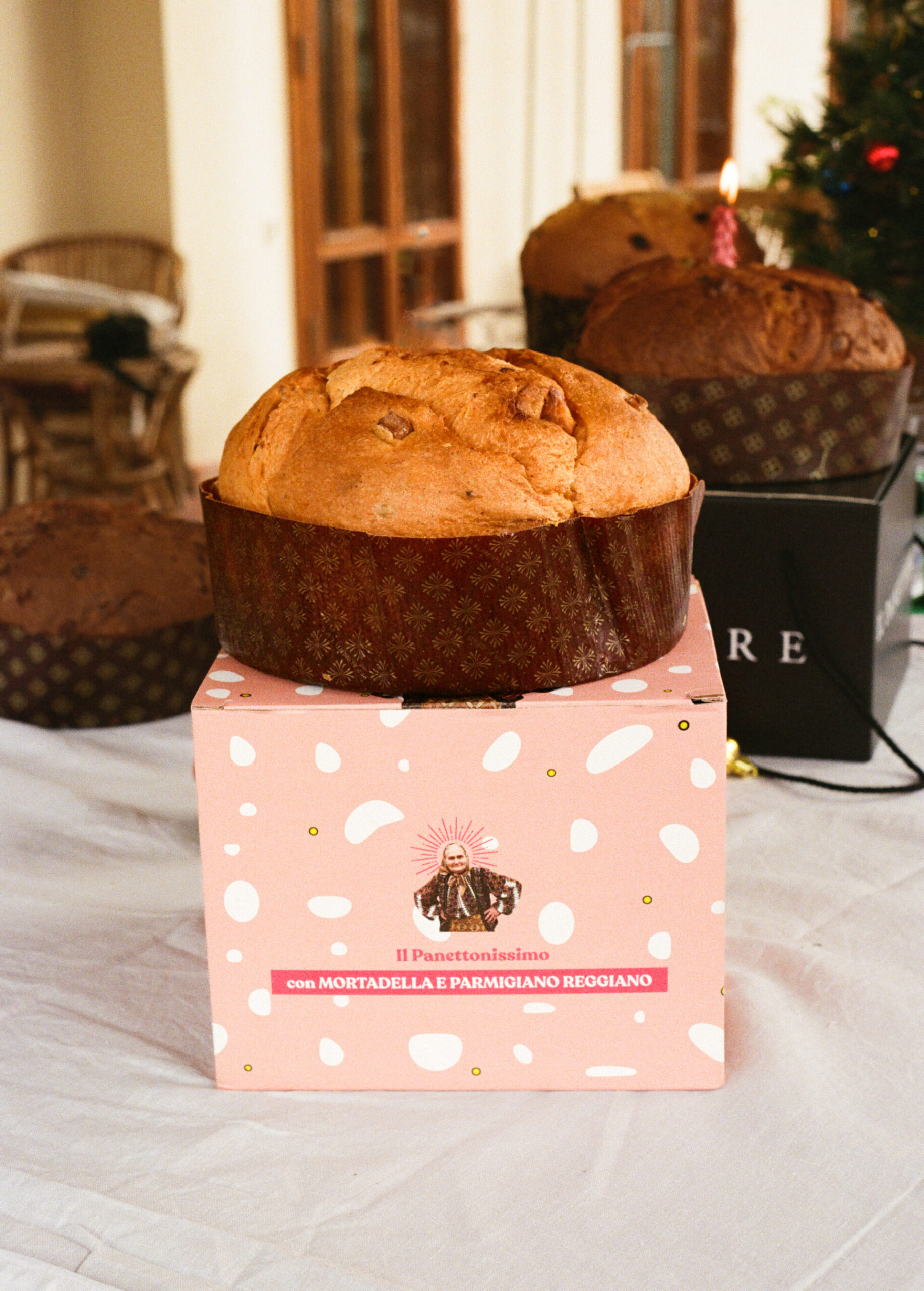 This is the panettone you eat for lunch, not after it. One of Bologna’s premier bakeries, Forno Brisa, which is strictly devoted to live sourdough, always knows how to go against the grain. Packed with large chunks of Parmigiano Reggiano and mortadella, it reminded us of a giant savory gougère with that signature sourdough bubbling. Aesthetically, it is more rustic than its sweet siblings, though it does arrive in a fun, funky box with a giant mortadella pattern.