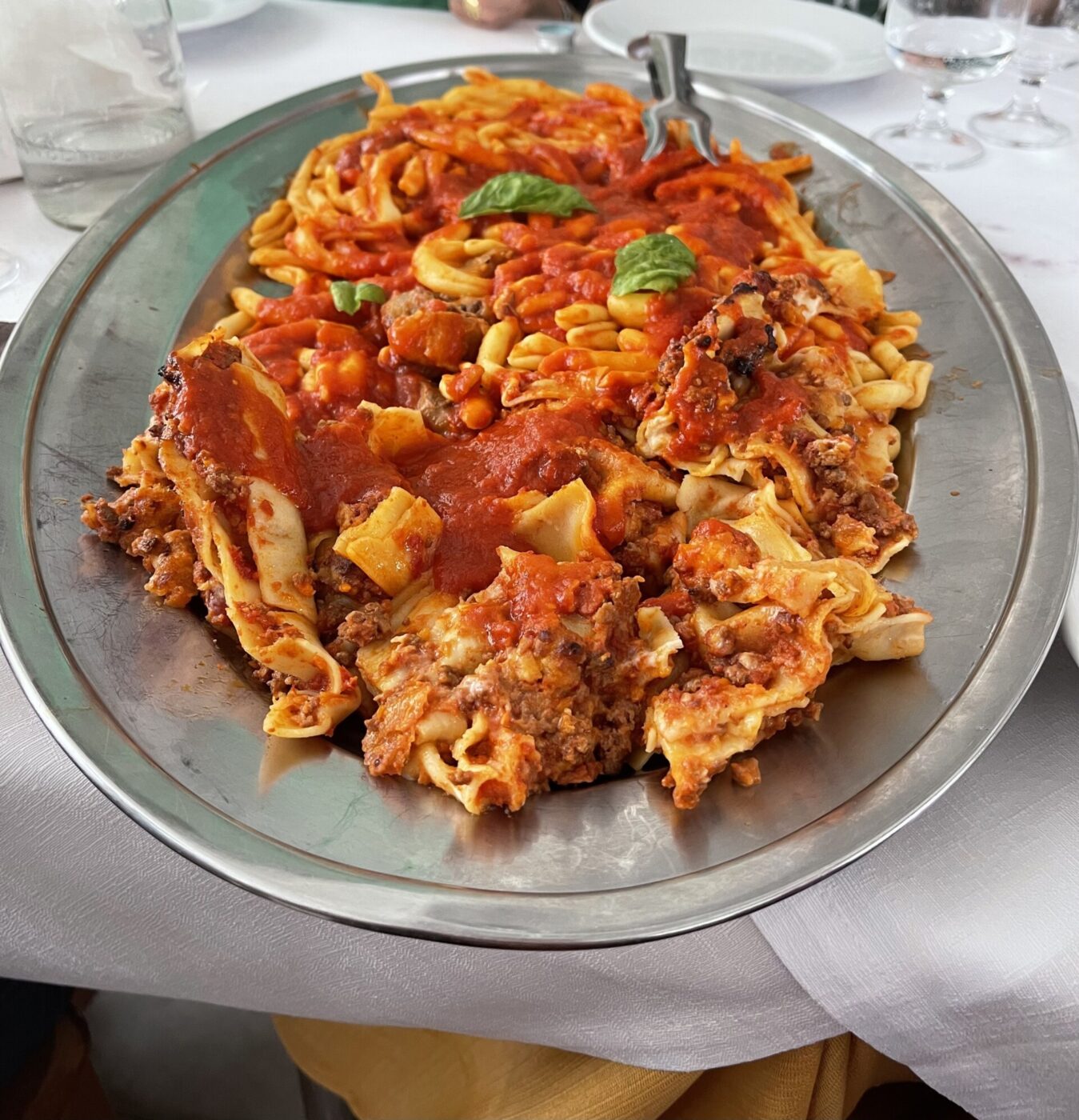 La Casareccia – Located about 10 kilometers from Paestum on flatter terrain near the sea, La Casareccia is a vibrant locale with a no-frills aesthetic and lush green surroundings. Traditional sturdy wooden tables fill the large dining room, where the charismatic staff serve sizable portions of Campanian classics to regular and visiting patrons. In the warmer months, snag a table in their outer room for a sunny lunch of seemingly endless antipasti, grilled meats, seasonal veggies, house-made fusilli, and even thin-crust pizza, if you fancy. It’s a great place to start your Cilento journey, as the owner and other waiters will be eager to share tips and converse with you. It’s also an events space, and when I came for lunch, we witnessed the bonhomie of a Neapolitan wedding.
