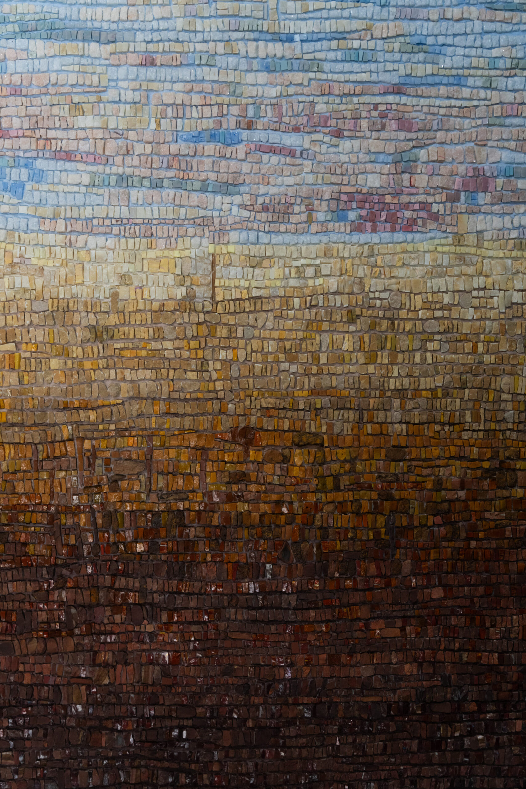 Mosaici in movimento? Anche se questo può sembrare un paradosso, il trio artistico ravennate CaCO3 rappresenta una nuova frontiera della sperimentazione musiva. Invece di usare la tradizionale tessera di mosaico, Âniko Ferreira da Silva, Giuseppe Donnaloia e Pavlos Mavromatidis esplorano composizioni di vetro, calcare, mattoni, foglia d’oro e marmo su sfondi di malta di colori diversi, creando composizioni che diffondono la luce e che portano con sé un proprio senso di movimento e ritmo.