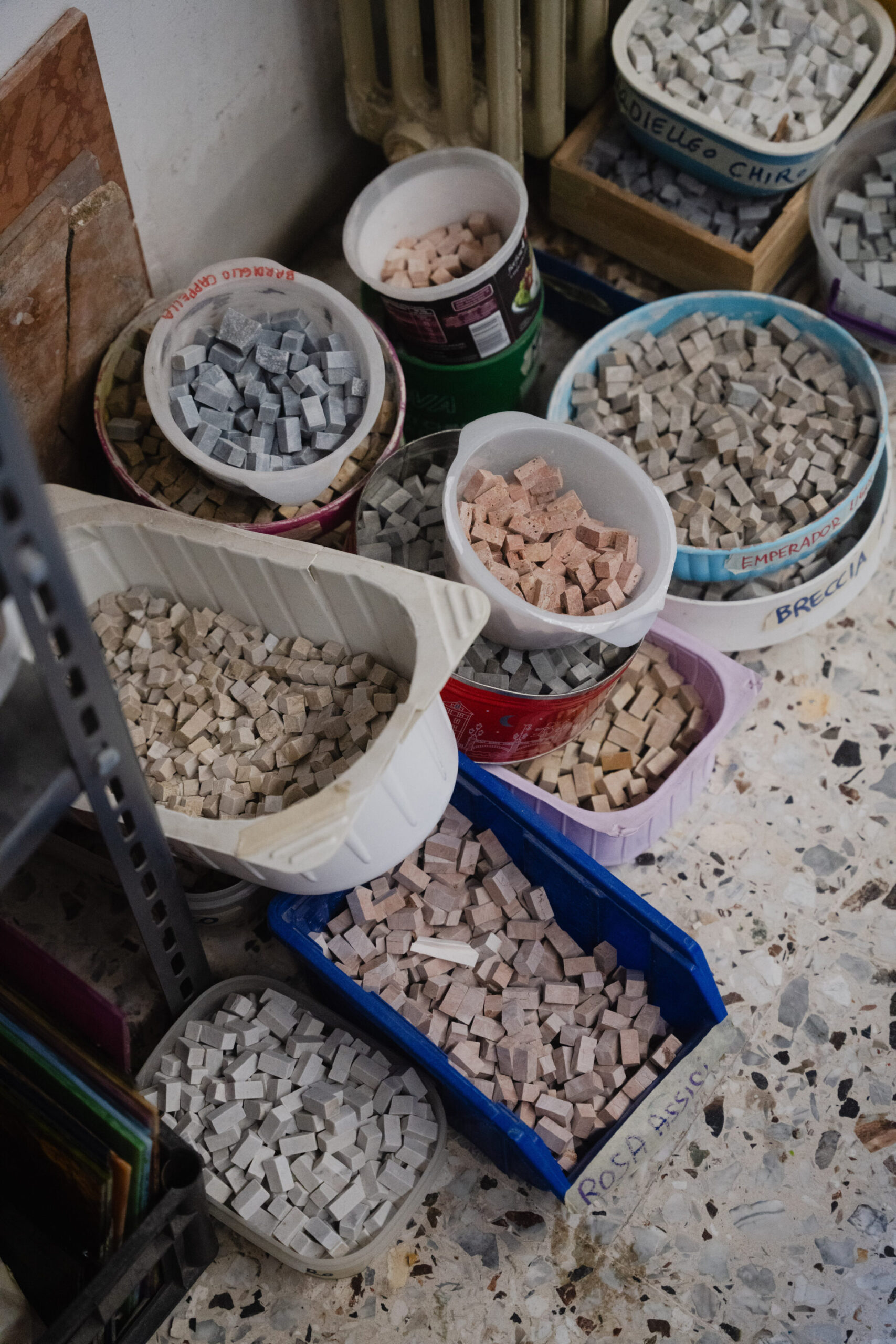 È un grande giorno per Montalbini, e questa è una cosa importante. Con “scelta punk” probabilmente si riferisce al fatto che qui, nella sua città natale, Ravenna, una città con un’eredità di mosaici che risale al V secolo d.C., il suo mosaico di 10 metri per quattro (che copre l’intero pavimento di quella che storicamente era l’entrata principale della città) è un’installazione “vivente” che probabilmente ridefinirà la percezione pubblica dei mosaici, sia ora che per le generazioni a venire.