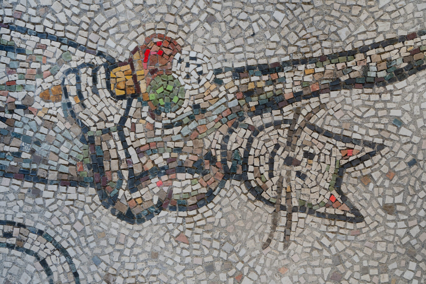 A prima vista, la scena ha tutte le virtù estetiche e tecniche di un antico mosaico romano che potrebbe essere esistito a Pompei, Ostia Antica o Aquileia. Ma a un’analisi più attenta, il pavimento di Montalbini pavimento rivela il suo soggetto surreale, fantastico e persino autobiografico: una scena che fonde passato, presente e futuro con un’accattivante spruzzata di umorismo. Tra i personaggi simbolici dell’opera ci sono una tigre, un orso, una sirena, uno struzzo e un uomo-gatto con un gelato in mano che, scopriamo, rappresenta il nonno dell’artista.