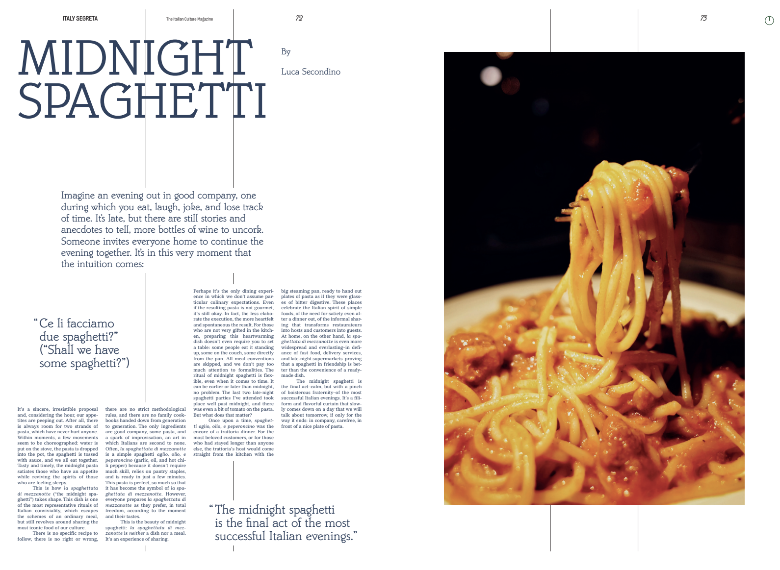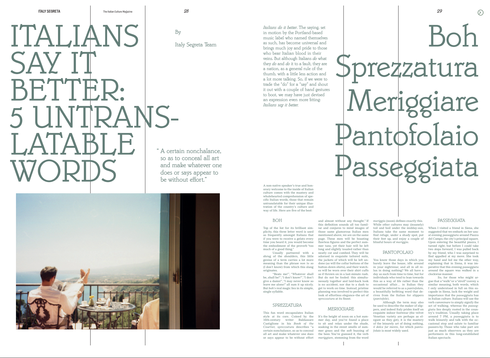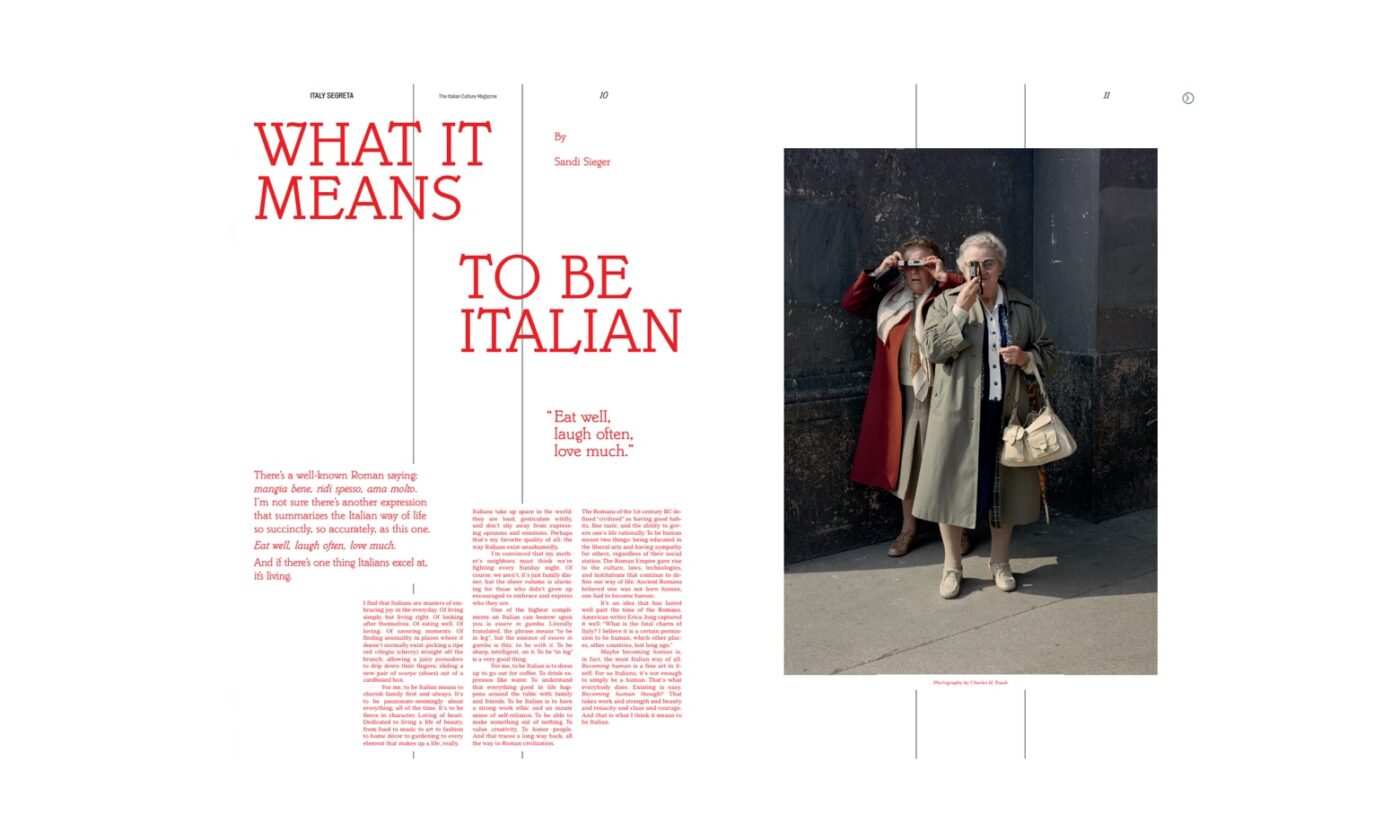 This is Italy Segreta’s Quotidianno: the first-ever, limited-edition selection of articles from our site! This annual magazine pays homage to the very Italian quotidiano, or daily newspaper, while timelessly capturing la quotidianità, the daily life, of our country. We take you through the early morning melody of the coffee bar, the requisite pennichella (afternoon nap), post-night out spaghetti, and everything in between–Italian style.