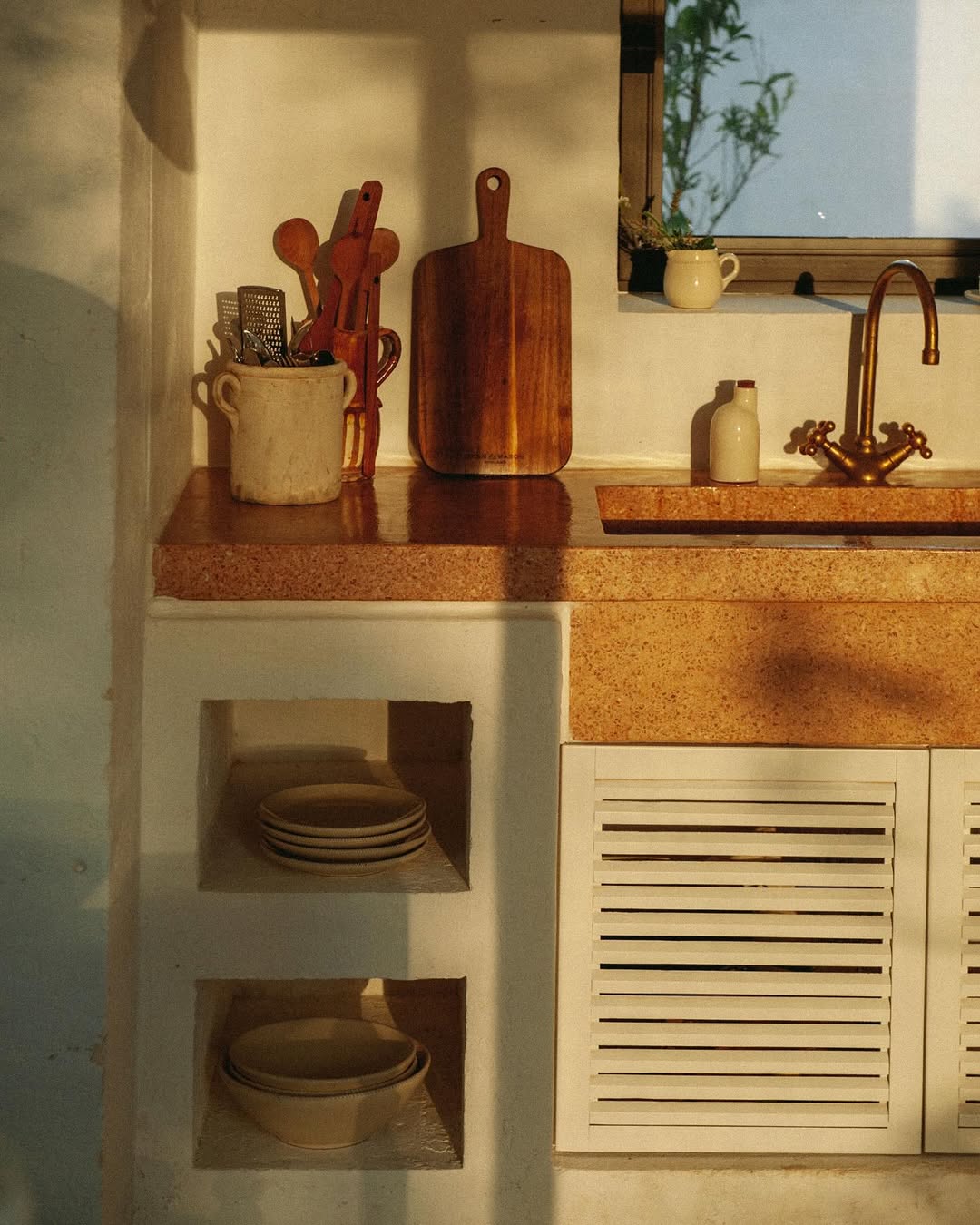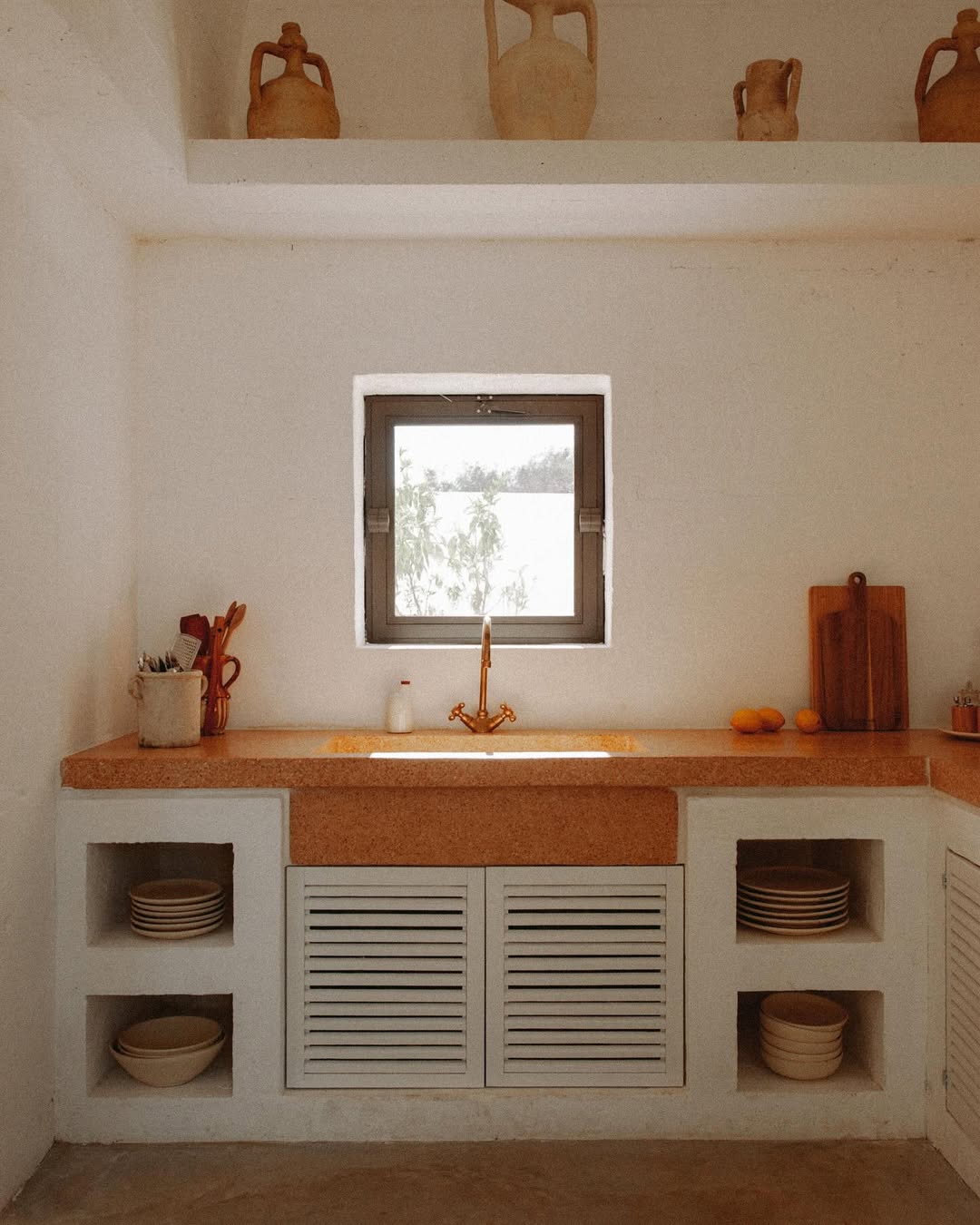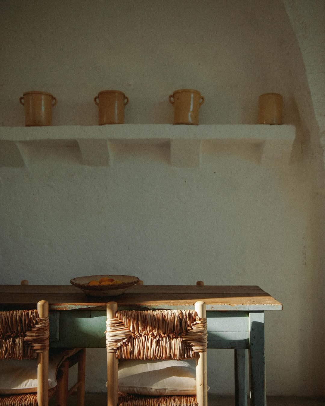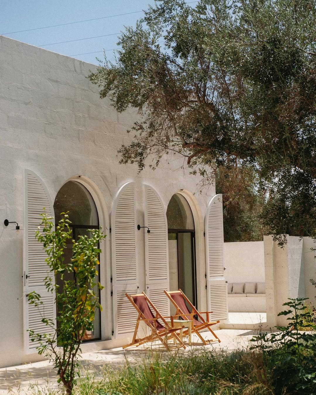To bring this dream to life, he collaborated with renowned architect Andrew Trotter, whose studio is celebrated for its soulful, minimalist interpretation of vernacular Mediterranean architecture. Trotter’s touch is evident in the striking simplicity of the self-contained houses (or casali), where traditional elements like neutral tuff (local sandstone) and vaulted ceilings are highlighted, resulting in interiors that are airy, calming, and refreshing. Each features their own living area, kitchen, double bedroom, bathroom, and private outdoor space with a BBQ and shower, seamlessly connecting indoor and outdoor living. Plus, there’s one large shared garden with ancient olive trees and a pool. The project, which took over a year just for the research and sourcing of local master artisans, masterfully blends high design and indigenous craftsmanship.