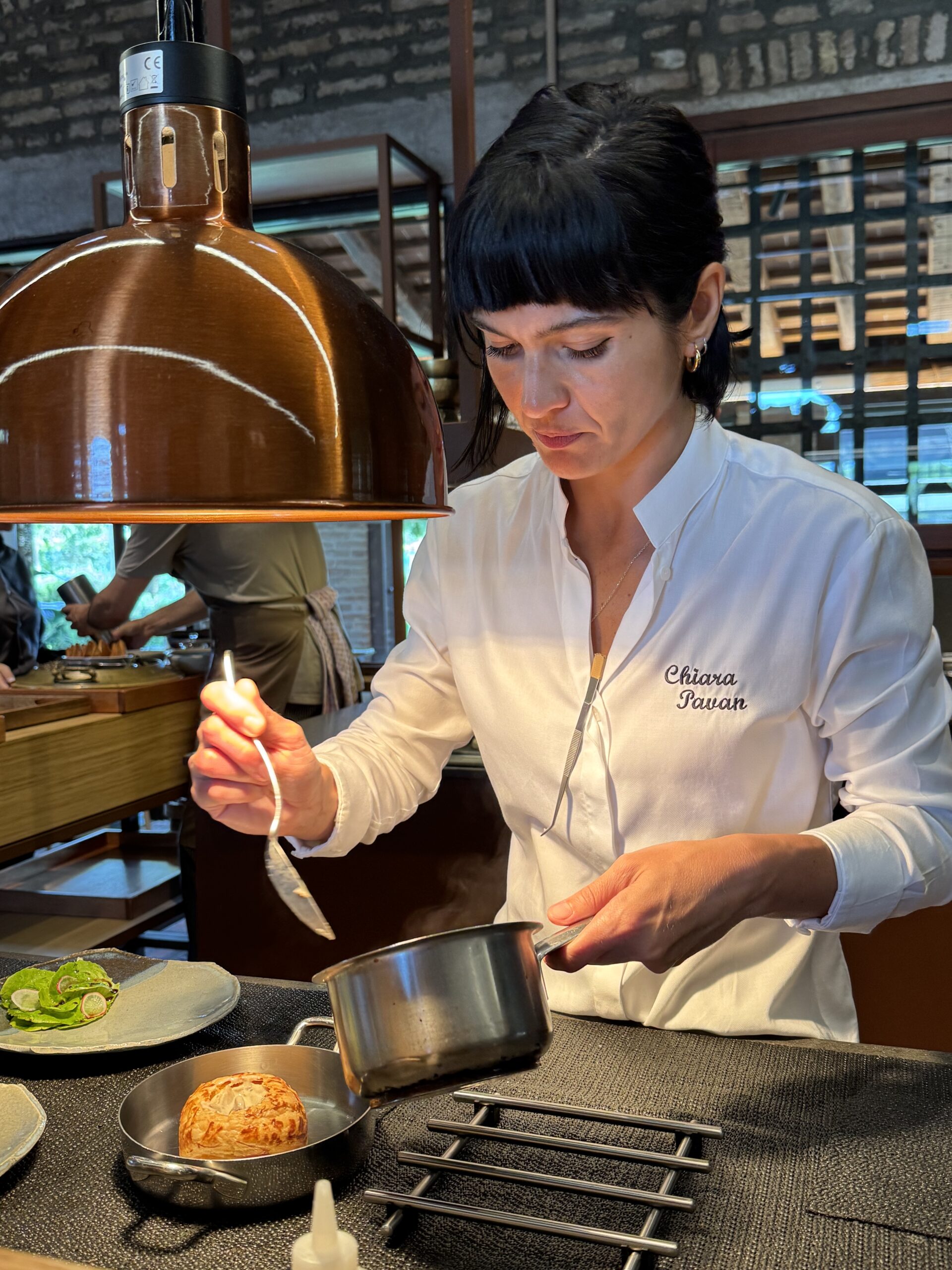 With a background in philosophy and a subsequent shift to gastronomy and a training at ALMA, Chiara Pavan arrived in Venice in 2017. Alongside her partner Francesco Brutto, she took the helm at Ristorante Venissa on the island of Mazzorbo in the Venetian lagoon. Their collaboration has shaped Venissa into a restaurant deeply rooted in sustainability and innovation, drawing directly and almost exclusively from the lagoon’s offerings for their supplies. Her approach to cuisine is what she describes as “environmental,” a philosophy that intertwines aesthetics, ethics, and political awareness. More than just a focus on organic, locally sourced ingredients, it is a response to the fragile ecosystem that surrounds her—a place of beauty, struggle, and transformation. Some standout creations that have embodied this vision over the years include the blue crab triptych—featuring blue crab tartare served au naturel, blue crab whipped butter, and blue crab pancakes—and dishes built around the invasive giant sea snail rapana venosa, treated like a fine fillet and served, depending on the season, alla cacciatora or with a green pepper sauce. Another longstanding signature is the green ravioli with bitter leaves, made using foraged herbs from the Venissa estate.